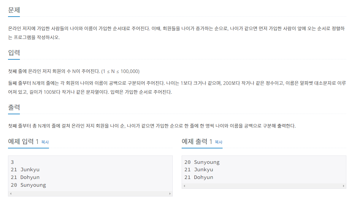 회원의 나이와 이름을 받고 나이순으로 정렬하되 나이가 같으면 가입한 순으로 정렬을 하는 문제입니다.