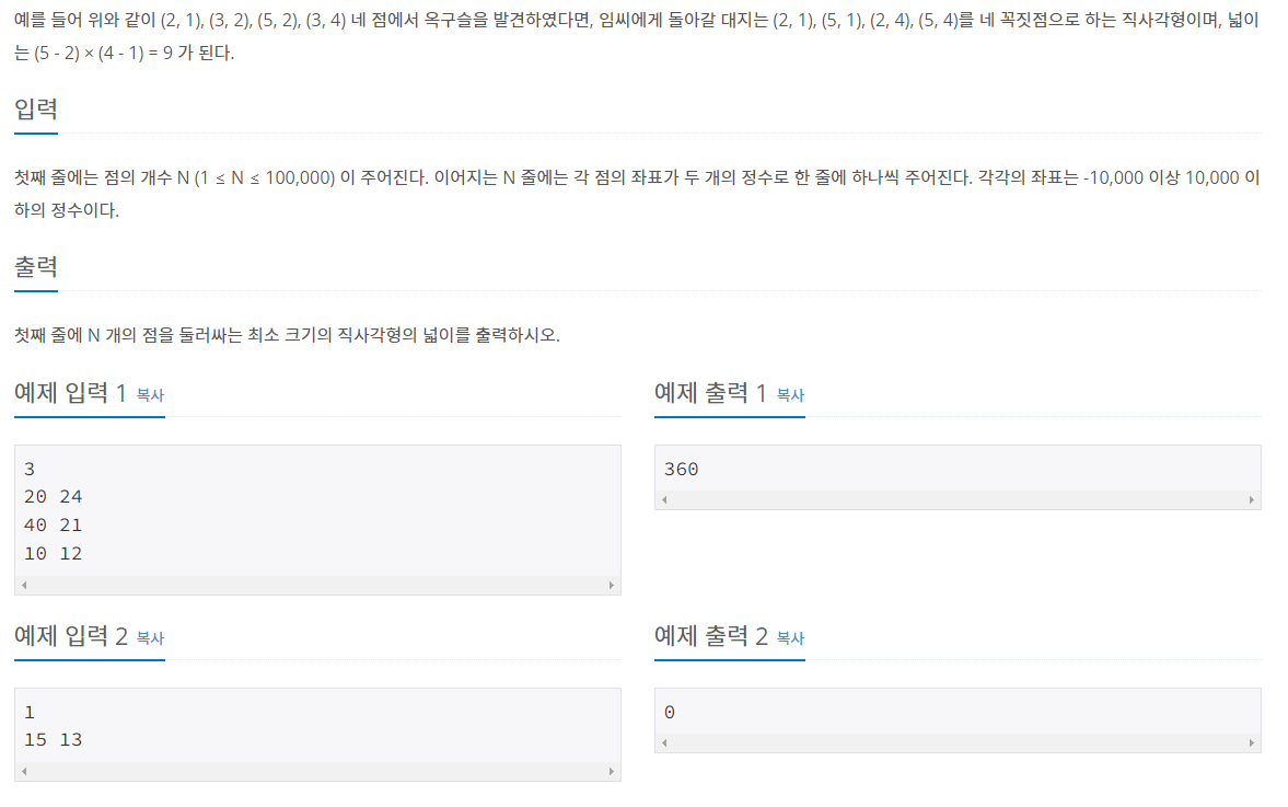 좌표 값을 받아서 그 점으로 그릴 수 있는 최대 직사각형을 그리고 넓이를 구하는 문제입니다.